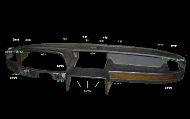 Major bolts (9mm x2) holding dash to frame right side left side Here's the little bugger! Miscellaneous Remove strips disconnect instrument panel lights disconnect center heater vent (retaining clips only) disconnect climate control unit (3x screws) Remove dash Remove the dash SLOWLY. Do not force. I found it helps to tilt the dash a little bit towards you and work on getting the passenger side out first. Make sure that as you remove the dash to keep an eye on all those wires to make sure you didn't forget to disconnect something. Removal yeeha! (god, what a mess..) Installation Installation of the new dash is reverse of removal (ha