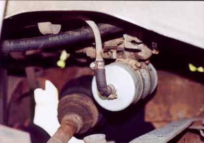 Now, you've finished the easy part. Here comes the big fun. The rear hoses consist of a crazy mess of twisting and turning hose connecting the fuel filter and pre-pump to the pump. This bundle of joy is hanging underneath the passenger rear fender. Removal of the wheel is necessary for easy access (unless you want to crawl on your back more than you really have to. In that case, you can leave the wheel on). The other part of this assemblage are the two hoses going from the main pump by the fuel tank (accessed through the trunk) to the fuel filter section.