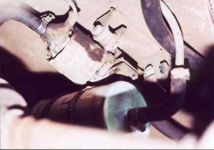 Beginning with the first part, the fuel filter assembly, lets tackle the fuel filter itself. You will need to remove the hose clamps from the fuel filter on either end, and then remove the large clamps that hold the fuel filter canister to the mount. BEWARE of the orientation of the fuel filter, make sure that you pay attention to which way the fuel filter's directional arrow is pointing. (if its still visible on the side of yours, I had to wipe away alot of dirt to see the arrow on my old one). When you place the new filter in the bracket, ensure that the arrow is pointing in the same direction as the old fuel filter's arrow was. Tighten up the bracket clamps that hold the filter on, but leave the hoses hanging for now as they will be replaced in a moment.