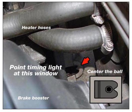 On the bell housing, driver side, under the heater hoses ( in the dark ) is the timing window. This is where you or your assistant will be pointing the timing strobe light to see the little ball to center it on the point by twisting the distributor clockwise or counter-clockwise.